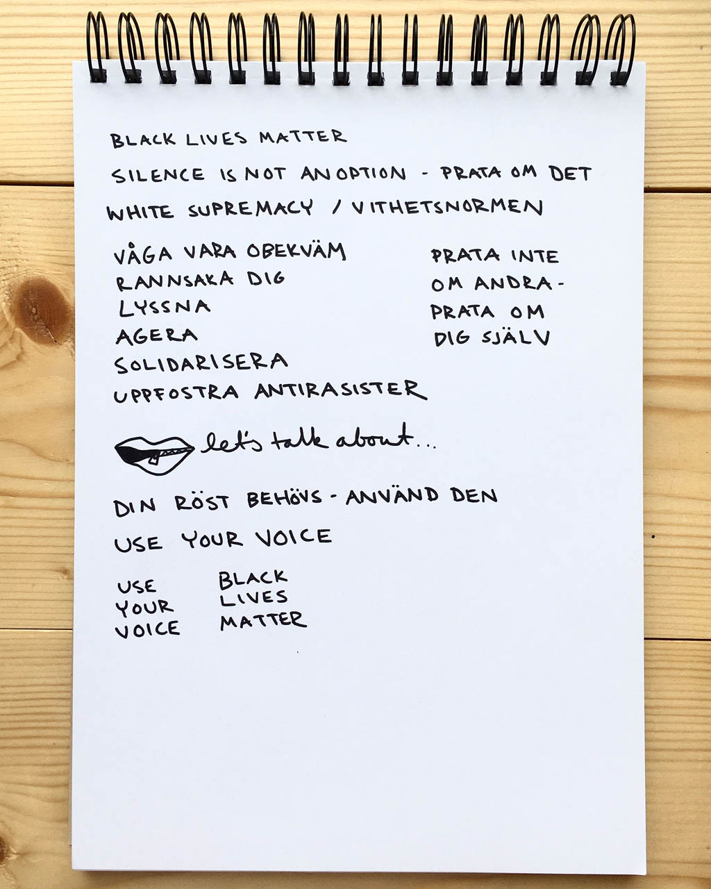 Jag hade en tanke om att jag ville göra en affisch för Black lives matter-rörelsen, så jag började med att skriva upp meningar och ord som dök upp när jag såg personer prata om BLM på Instagram. Jag ville att affischen skulle handla om hur en kan vara en bra allierad. Jag fick en bildidé om en mun med en dragkedja på. "Use your voice - black lives matter" blev texten jag till slut fastnade för.